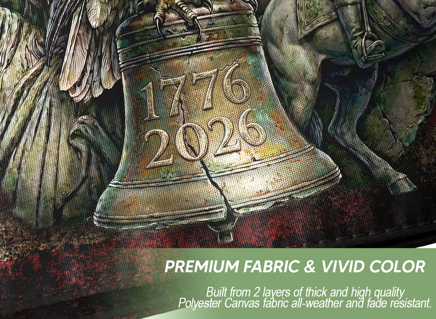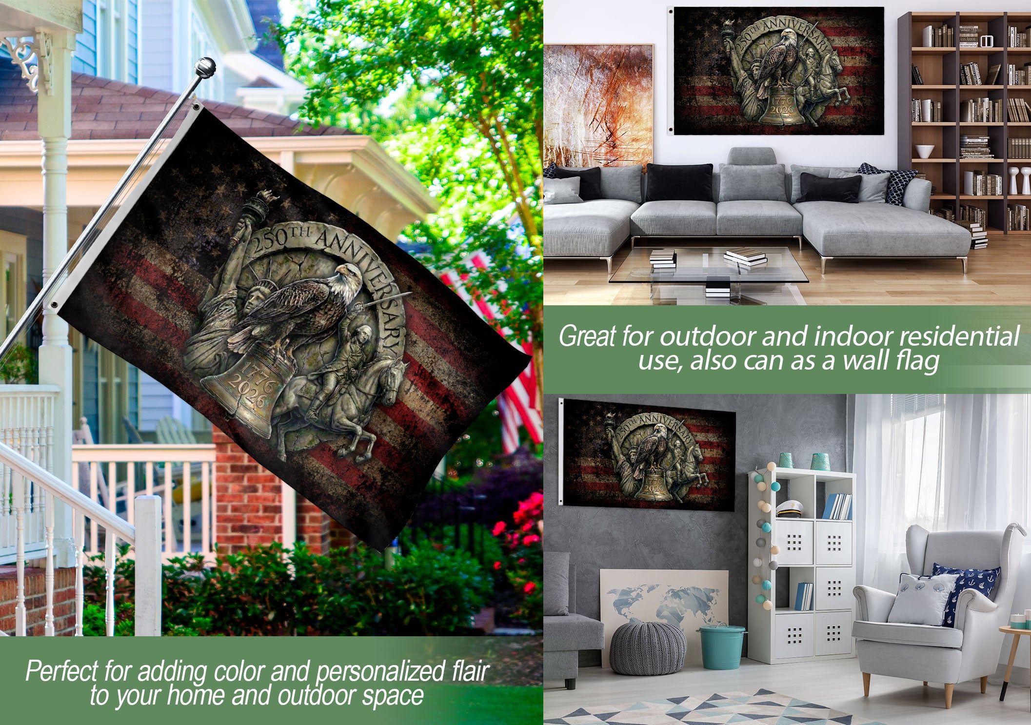 Commemorating 250 years of history, this striking flag features a powerful eagle standing at the center, symbolizing strength, freedom, and unity. Set against a timeworn American flag backdrop with the milestone years 1776–2026, the design honors the enduring legacy and spirit of the United States. A meaningful decorative piece for home display, outdoor settings, and patriotic celebrations marking the nation’s 250th anniversary.