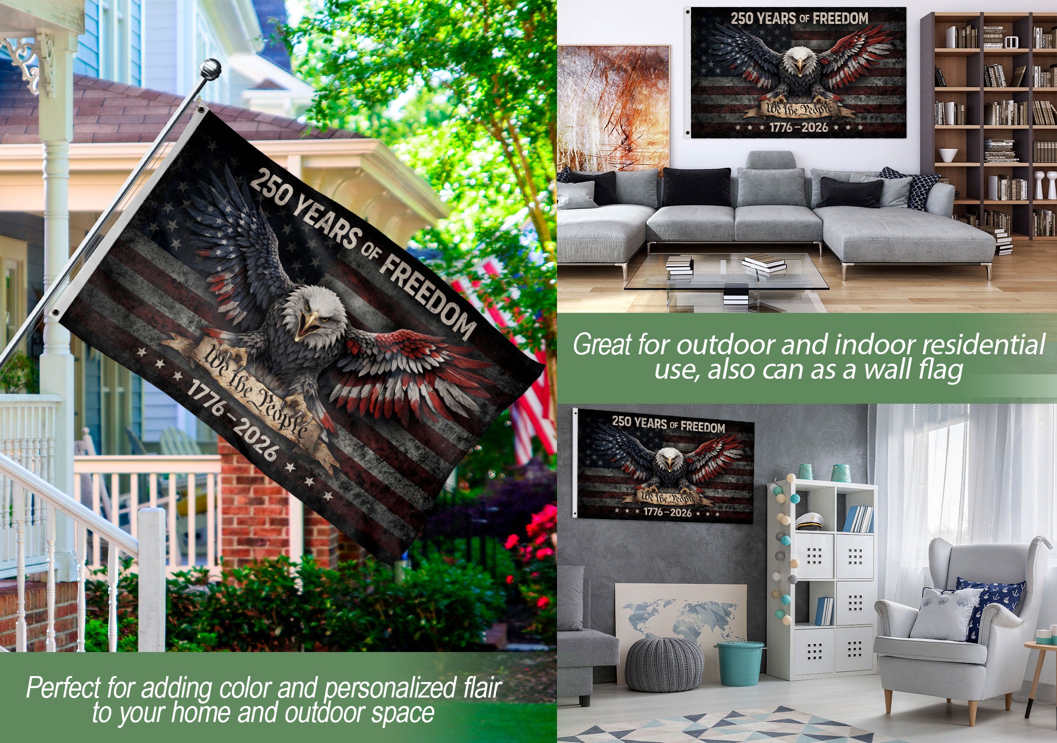 Designed for impactful display, this double-sided flag features We The People and commemorates the United States. A proud symbol of freedom and shared values, it celebrates 250 years of American heritage and national pride.